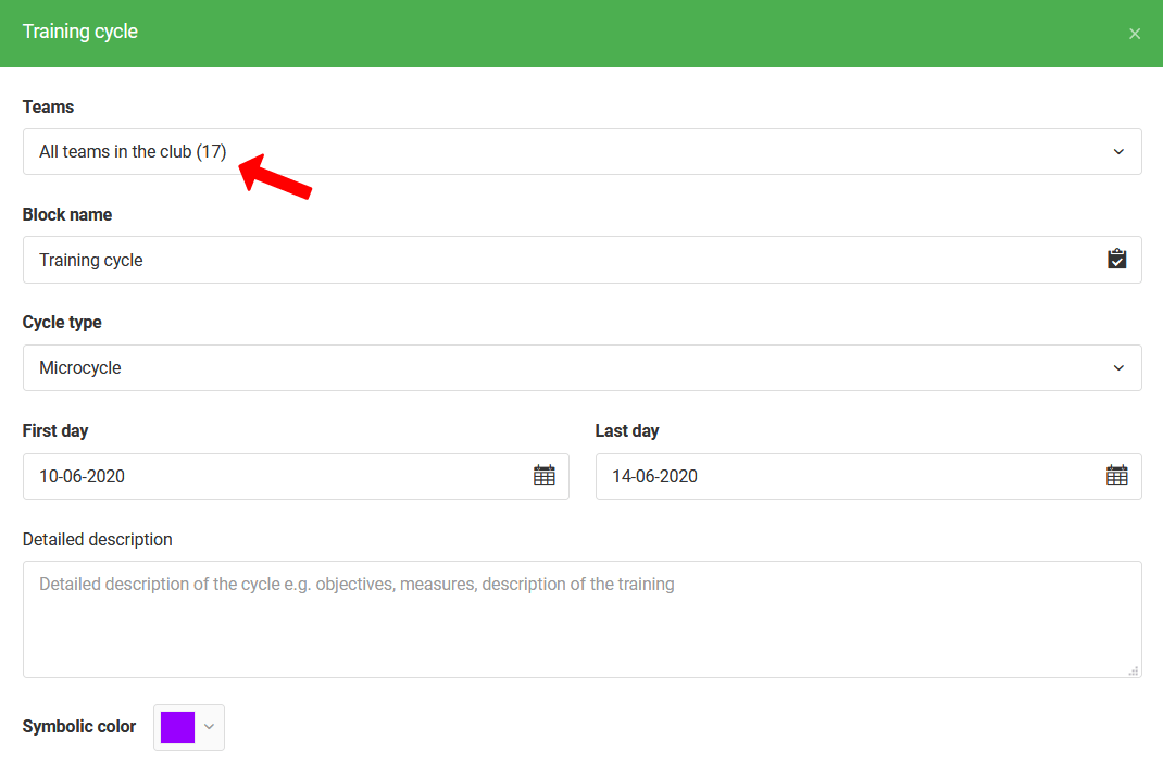 Ο τελευταίος τύπος συμβάντος που μπορείτε να προσθέσετε στο ημερολόγιό σας ως διαχειριστής είναι ένα προπονητικό κομμάτι. Αυτό είναι ένα εξαιρετικά σημαντικό στοιχείο για τον προγραμματισμό της εργασίας σας στο κλαμπ. Σας επιτρέπει να αντιστοιχίσετε μικρόκυκλο σε συγκεκριμένες ομάδες. Το πρώτο βήμα στο σχεδιασμό ενός προπονητικού κομματιού είναι να επιλέξετε τις ομάδες για τις οποίες θέλετε να δημιουργήσετε έναν μικρόκυκλο. Στα επόμενα βήματα καθορίζετε το όνομα, το χρώμα, την περιγραφή και τη διάρκεια του προπονητικού κομματιού.