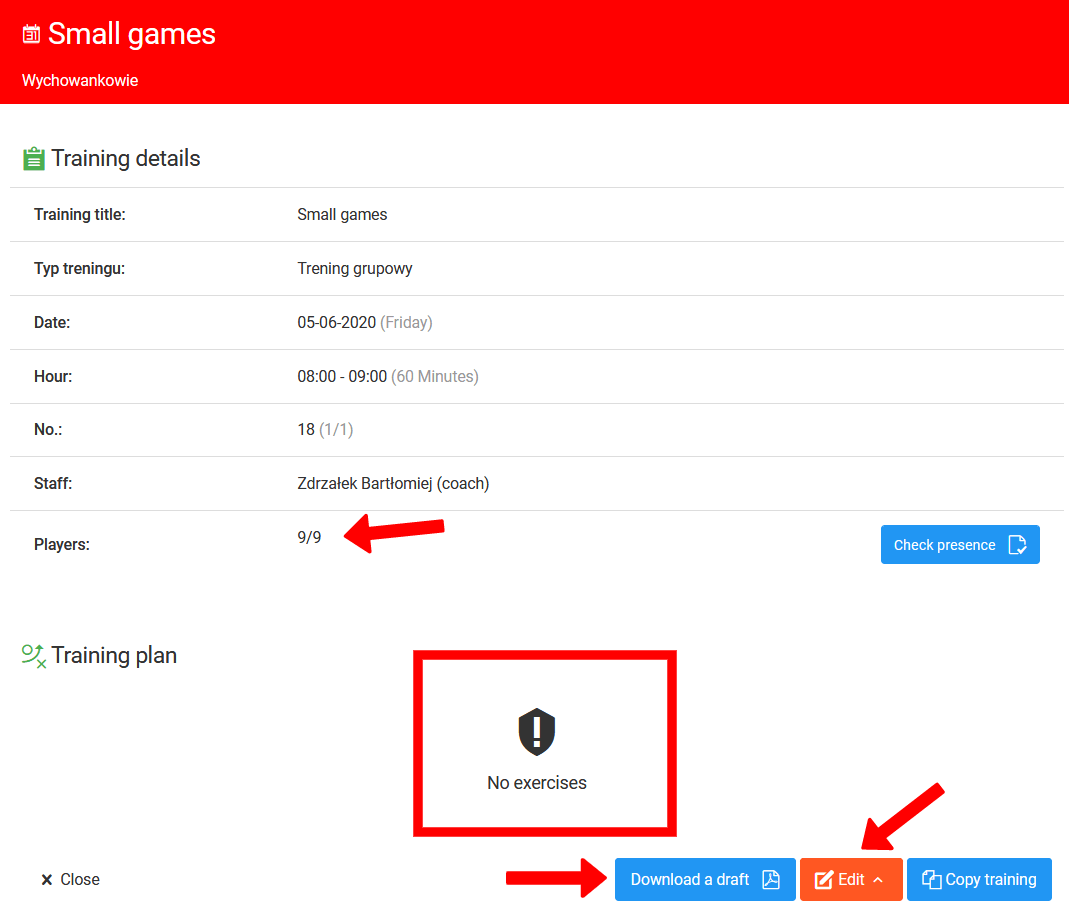 Ένα άλλο σημαντικό χαρακτηριστικό που θα βρείτε στο ημερολόγιο του συλλόγου σας είναι η δυνατότητα ελέγχου των λεπτομερειών κάθε προστιθέμενης προπόνησης. Κάνοντας κλικ σε μια προπόνηση στο ημερολόγιο, θα δείτε ένα παράθυρο με τις λεπτομέρειες της συνεδρίας. Πολύ γρήγορα θα μπορείτε να επαληθεύσετε εάν ο προπονητής έχει προετοιμάσει ένα σχέδιο ή έχει ελέγξει την παρουσία.