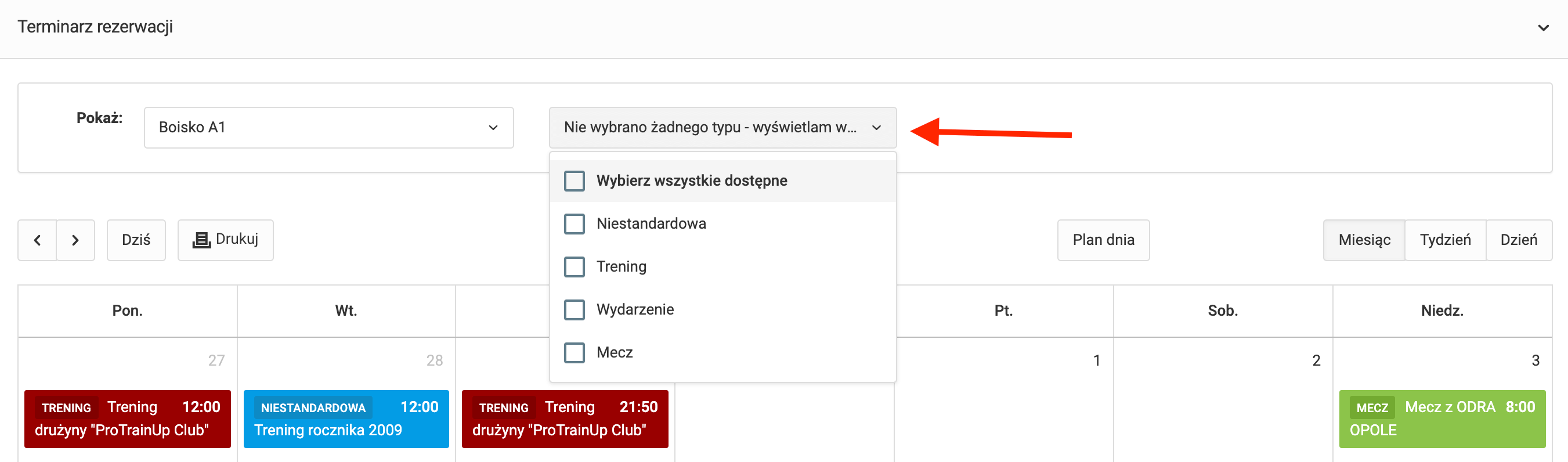W podglądzie każdego pod obiektu, w dolnej części strony, znajduje się terminarz rezerwacji danego pod-obiektu. Powyżej kalendarza masz możliwość filtrowania konkretnej lokalizacji oraz konkretnego typu wydarzeń w celu zwiększenia czytelności kalendarz w razie wysokiego obłożenia rezerwacjami.