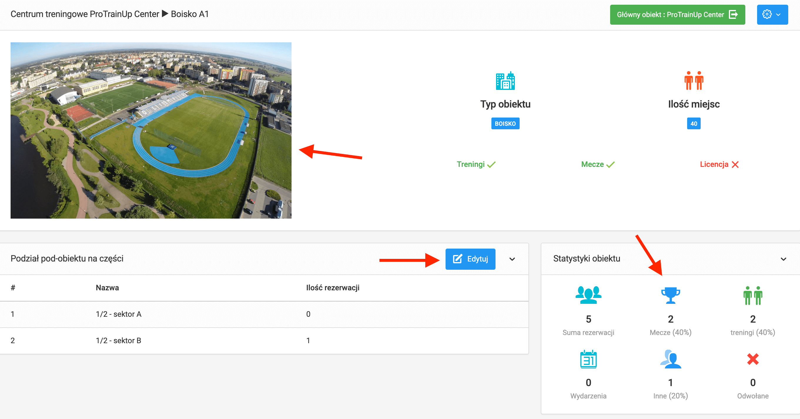 W podglądzie danego pod-obiektu masz możliwość podejrzeć najważniejsze informacje na temat: danych kontaktowych, zdjęcia oraz statystyk jego obłożenia. Z tego też miejsca masz również możliwość podziału pod-obiektu, np. boiska na strefy, to znaczy, że jedno boisko możesz podzielić np. na dwie połowy.